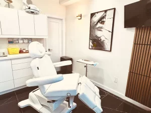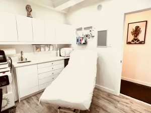 Clinic room set up for CO2 laser face resurfacing, equipped with modern amenities and ready for treatment.